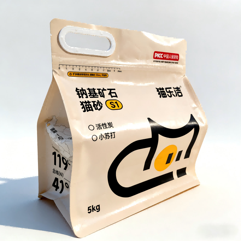 झोला संरचना: आठ-पक्षीय सील संरचनाले एक ठाडो, स्थिर आकार प्रदान गर्दछ, शेल्फ प्रदर्शनको लागि उत्तम। रिसेल गर्न मिल्ने जिपर र प्रबलित प्लास्टिक ह्यान्ड ग्रिपले 5kg बिरालोको फोहोरको सजिलो ह्यान्डलिंग र सुरक्षित भण्डारणको लागि अनुमति दिन्छ।